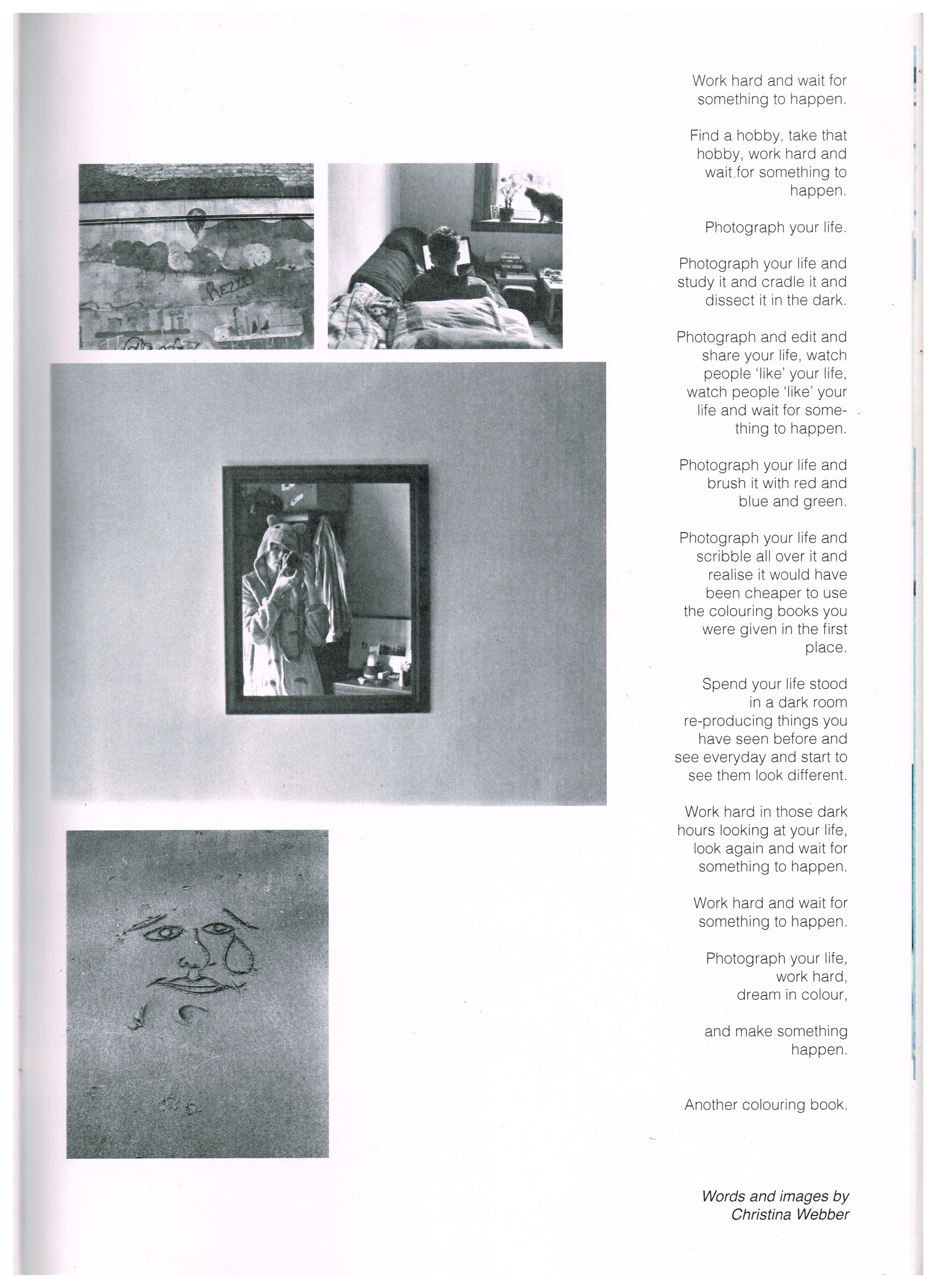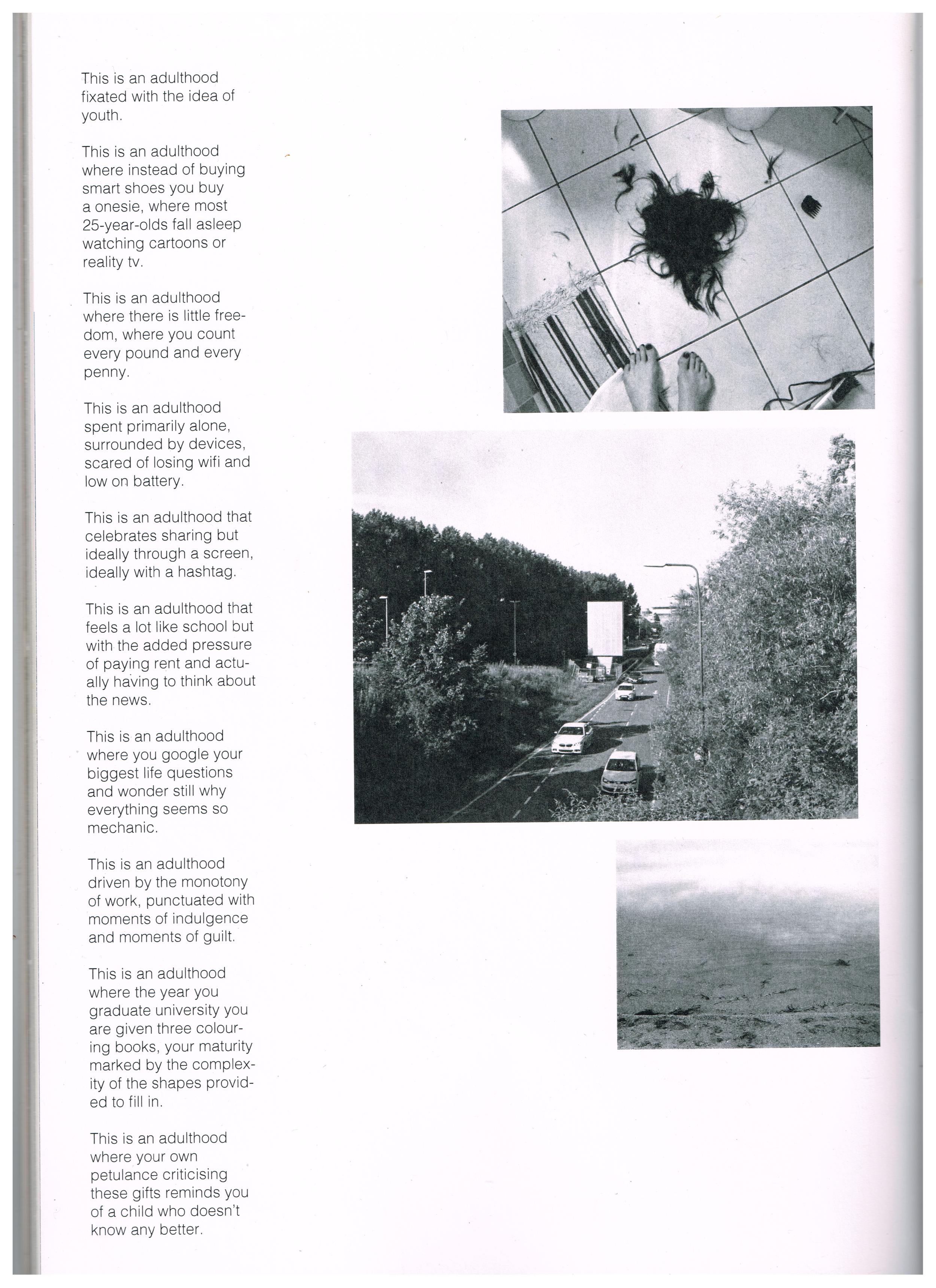 This body of work was born from a feeling of creative frustration and situational staleness following graduation. During this period I was given three colouring books from well-meaning friends and family. These gifts led me to question notions of creative success, millennial adulthood and maturity. I left the soaring rental prices of Edinburgh centre, moved to the outskirts, and began to use the longer commute to document the everyday. The images capture the cyclical flatness of a typical working week - but by using frameless printing and hand-colouring techniques these scenes are elevated into something illusory. In this way I have created another colouring book, of day-to-day observations. What remains is a document of the interim between youth and adulthood, and a wider reflection upon what we consider beautiful, successful and appropriate for the gallery wall.